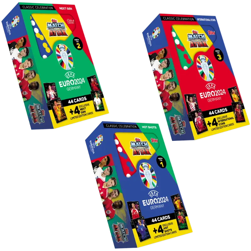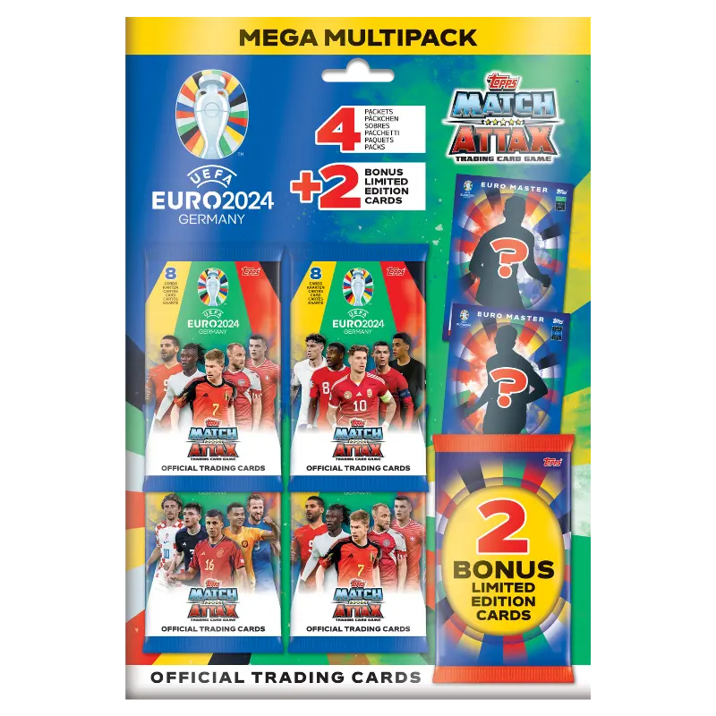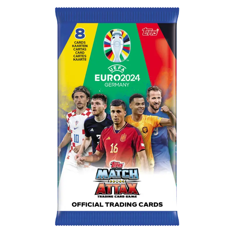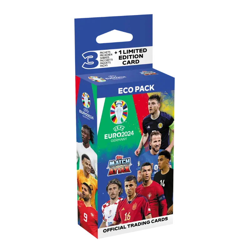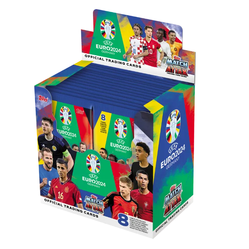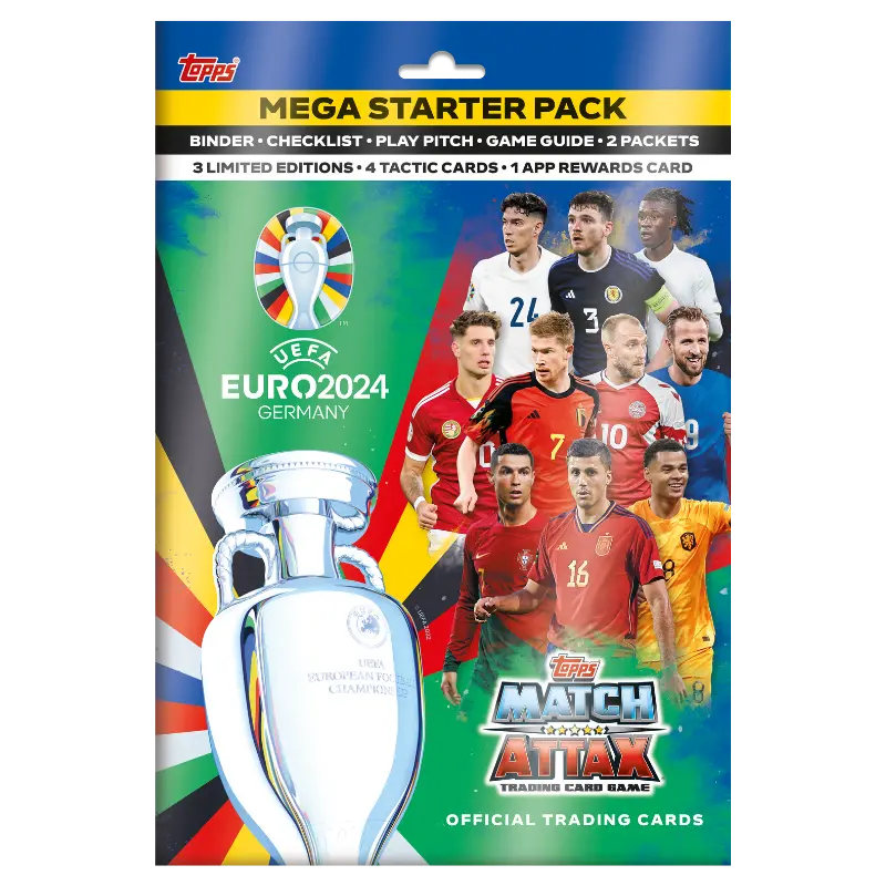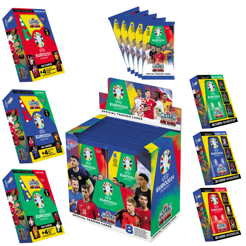 Topps is proud to present the first EURO 2024 Match Attax Collection - this new, incredible and eventful collection is full of exciting sets and unique cards featuring all the teams from the qualifying tournament. There are 457 cards to collect in different categories including Golden Goalscorer, Centurion, Hero, Ultimate, Graduated Gem, Legends, 100 Club and more. Look out for crystal, emerald and sapphire parallels, EURO Energy cards, EURO Black Edge cards, EURO Auto and Combo cards, EURO Chrome Shields and the ultra-rare Cristiano Ronaldo career celebration card.